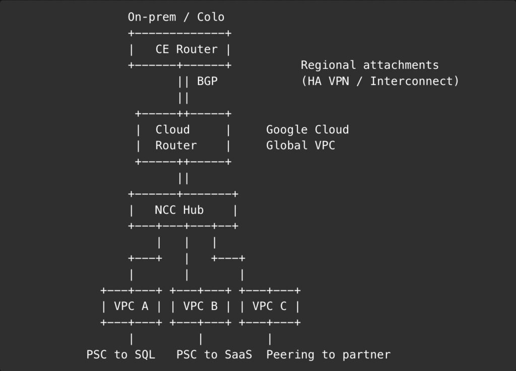 If you insist on a single giant box, you will end up using it as a hammer. Google Cloud encourages a tidier vice: choose the smallest thing that does the job, then let the global VPC and dynamic routing do the quiet heavy lifting. Need many VPCs to talk without spaghetti? NCC with spokes. Need two VPCs and a quiet life? Peering. Need only the sauce from Cloud SQL or a partner? PSC. Need the campus to meet the cloud without sticky notes of static routes? Cloud Router with HA VPN or Interconnect. Label the bag, not every screw.